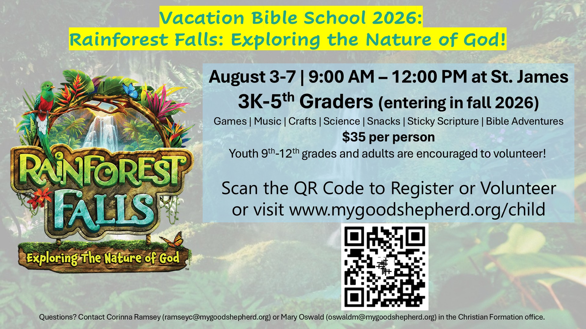 Get ready to journey into the rainforest as we discover the incredible nature of God! Step through the mist into Rainforest Falls, filled with wild waterfalls, towering trees, and colorful creatures. Throughout the week, children will discover who God is, how much He loves them, and what it means to be rooted in relationship with Him — our Creator and a safe place in life’s storms — growing closer to Him in their everyday lives.